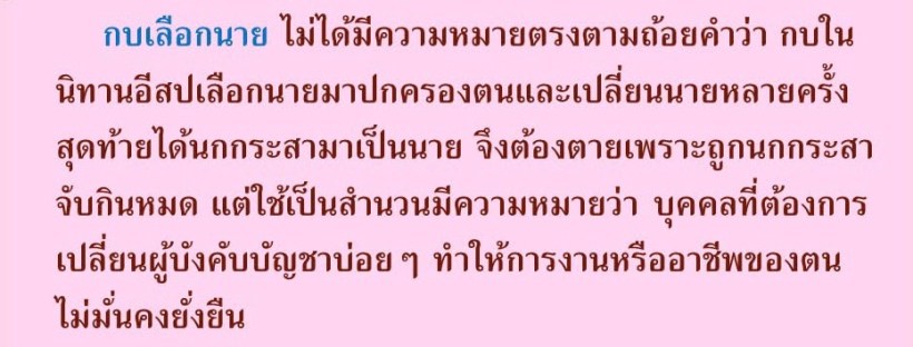 นี่คือแบบอย่างของกบเลือกนาย ไม่เคยย้อนมองตนเองว่ามีความสามารถหรือไม่ และต้องพัฒนาอะไรบ้าง มองแค่นายไม่โอเค สอนเท่าไหร่ก็ไม่ฟัง ขออวยพรให้เจอ เจ้านายในฝัน ซึ่งในความเป็นจริงแล้วนั้น ไม่มีอยู่จริง